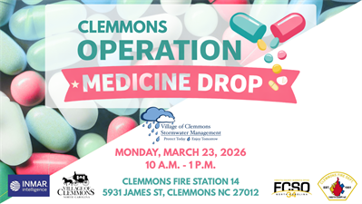 Residents can dispose of expired, unwanted, or unused prescription drugs and over-the-counter medications – no questions asked – during the Spring Medicine Drop at Clemmons Fire Station 14 with the help from the Clemmons Fire Department, Forsyth County Sheriff’s Office, and Inmar Intelligence. Please remain in your vehicle. This will be a drive-thru service. This is for households ONLY. PLEASE REMAIN IN YOUR VEHICLE - THIS WILL BE A DRIVE-THRU SERVICE.